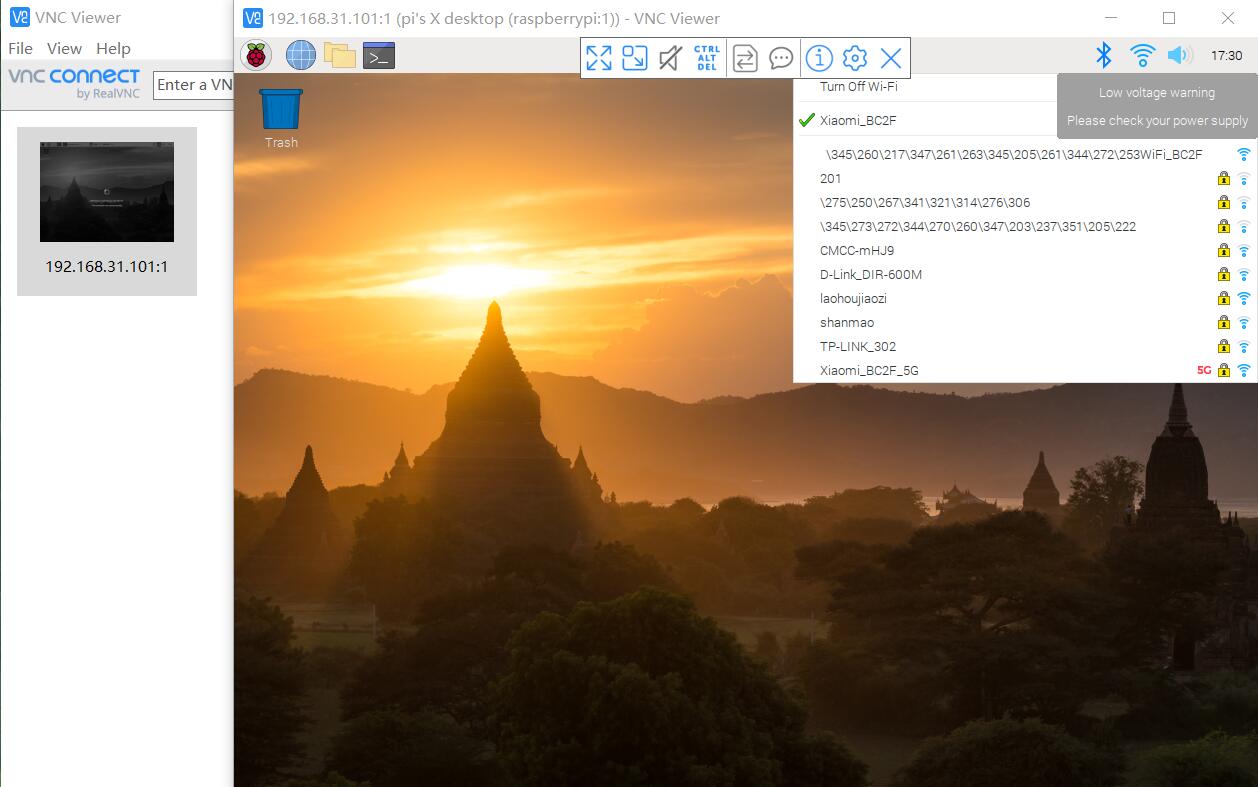 开启VNC流后,在VNC Viewer中输入 [IP地址]:[代号] 如:192.168.31.101:1,输入密码,连接树莓派上的服务端。可以通过图形界面链接无线网络或者做一些其他的操作了就。