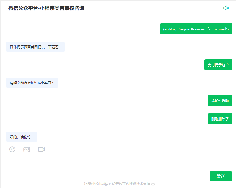 我在小程序类目里错误设置了b2b商户,然后马上删除了,现在小程序支付就报equestPayment:fail banned错误,b2b类目仅支持使用b2b支付,删除类目无效,若实际上不涉及b2b业务,可在类目管理页面点击联系客服,联系类目客服进行申诉。